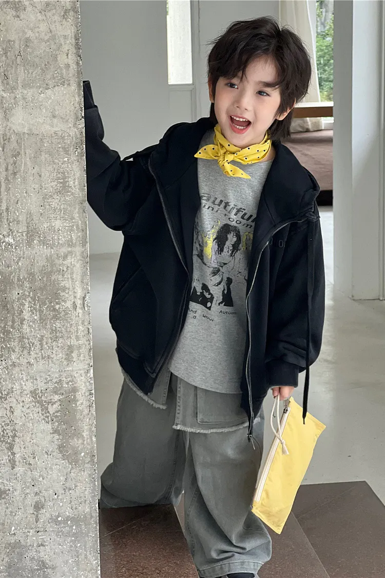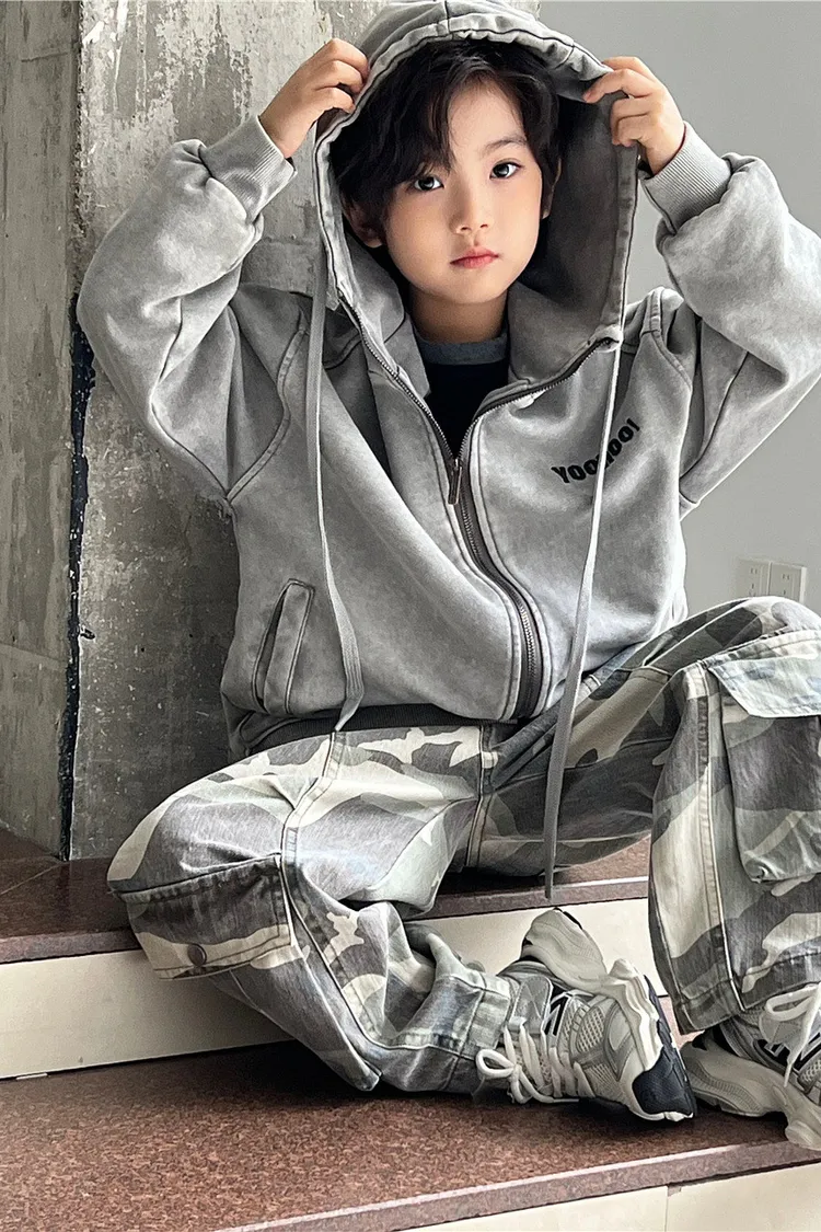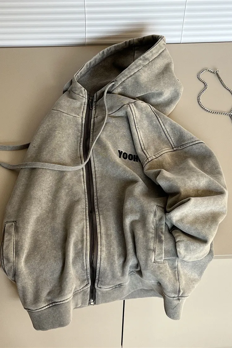 G0903英文繡字刷舊連帽外套(淺灰/深灰)